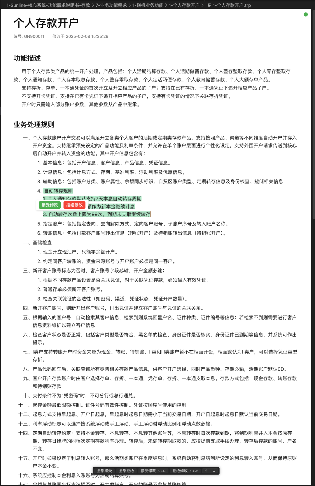 a. 智能標(biāo)注:基于對(duì)需求變更內(nèi)容的理解,AutoBA 自動(dòng)完成需求改寫,并在需求文檔中以色塊形式標(biāo)注修改內(nèi)容