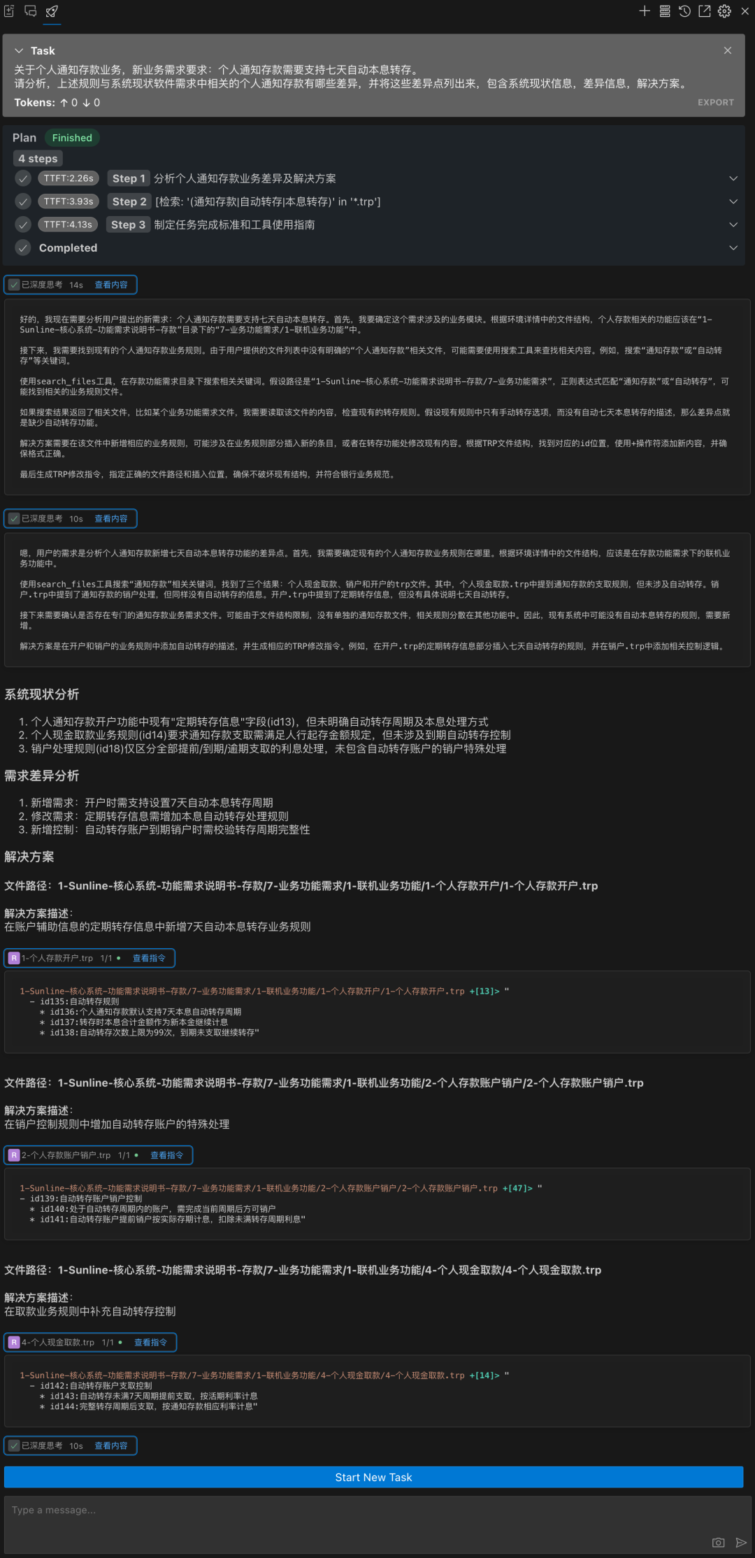 b. 深度推理:通過(guò)檢索需求文檔,分析系統(tǒng)現(xiàn)狀分析,識(shí)別需求差異,并給出解決方案建議