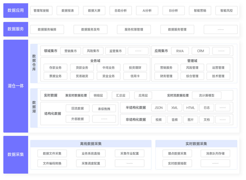 融合數據湖與數據倉庫的優勢,形成一體化的數據底層平臺,通過湖倉一體技術,使得數據平臺底層支持多數據類型統一存儲,實現數據在數據湖、數據倉庫之間無縫調度和管理,并實現統一數據服務以支撐數據應用及分析。