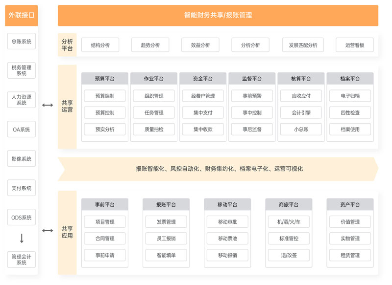 覆蓋全成本財務業務流程, 包括財務預算編制、預算管控、日常費用報銷、資金支付、資產管理、項目管理、合同管理、商旅平臺等