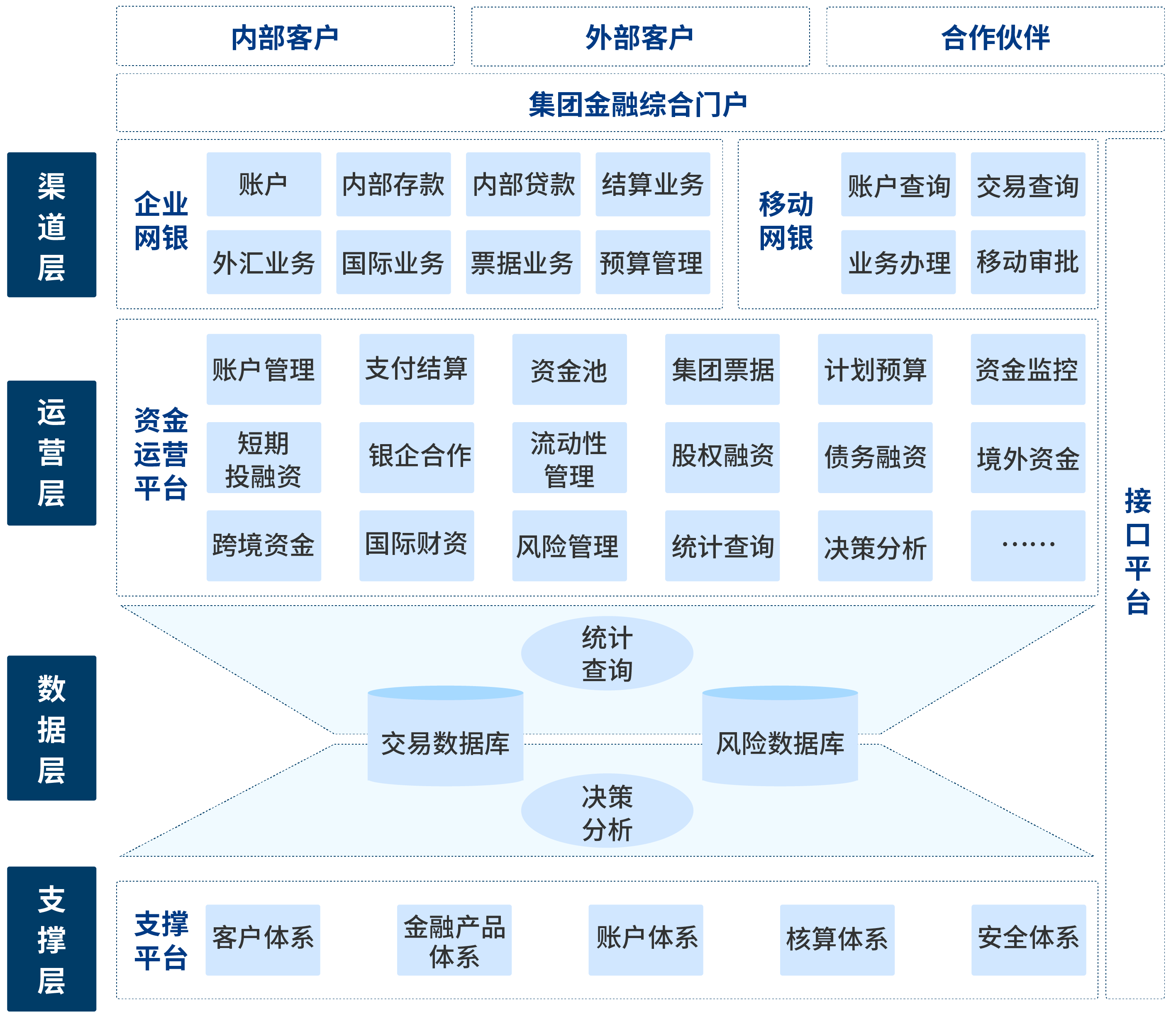 結合國內外集團資金管理行業的發展趨勢,依托銀行現金管理的先進經驗,打造先進、安全、高效的集團資金管理系統,為大中型企業集團提全面和可靠的資金管理解決方案,主要包括賬戶管理、資金預算、內部存貸款、資金池管理、投融資管理、流動性管理、決策分析等功能。